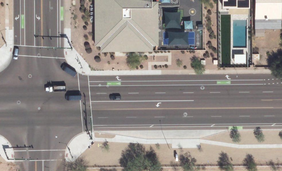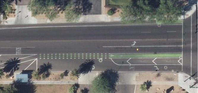 Below are examples of how green paint is used in bike lanes to remind drivers to watch for cyclists as they approach driveways and intersections. Similar temporary green paint will be added during the pilot period along Indian School Road and McDowell Road, as shown on the map.